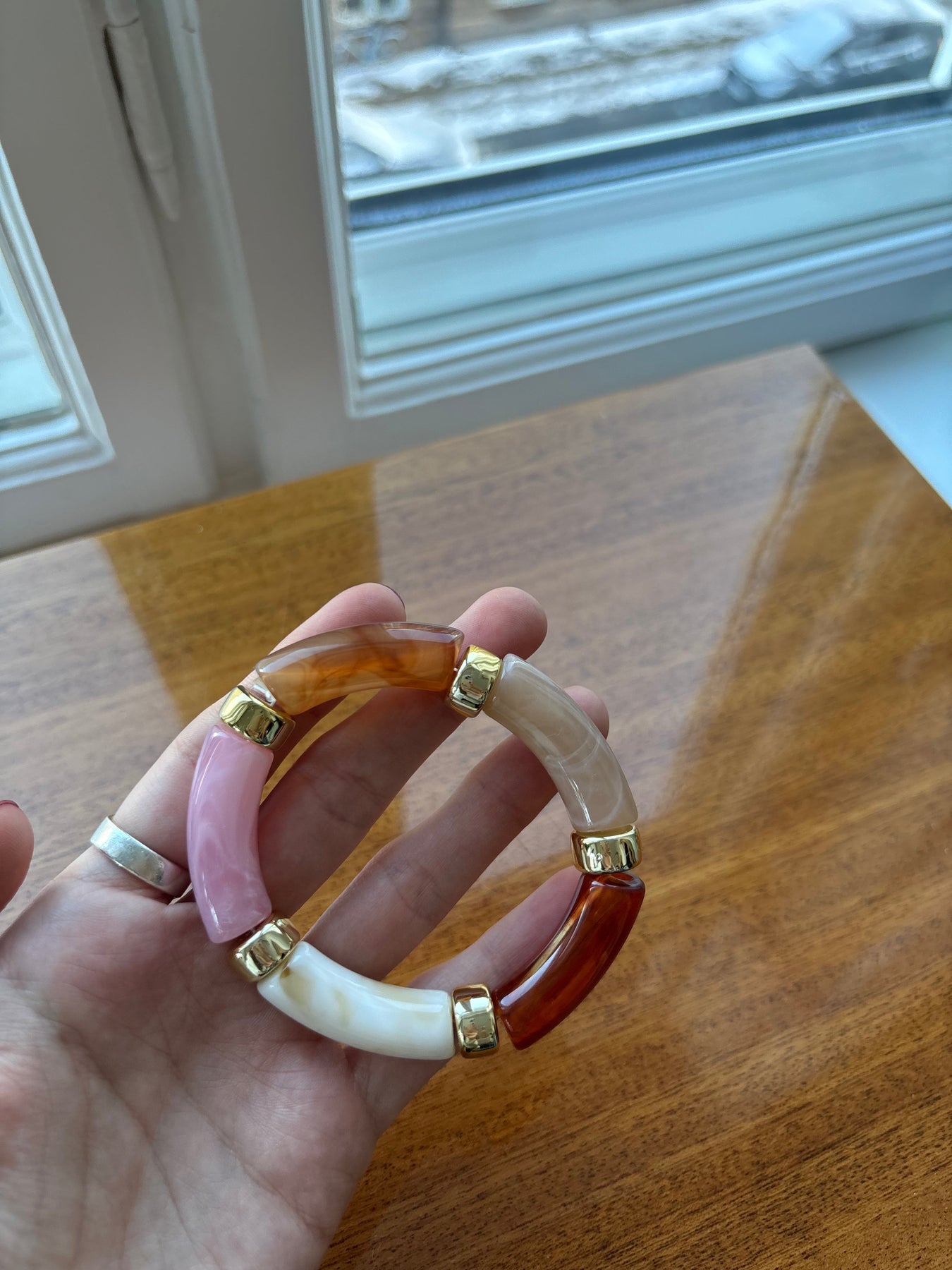 The Ora bracelet in pink and gold combines soft, marbled tones with elegant gold details. The rounded links create a harmonious and exclusive look that feels both feminine and modern. A refined bracelet that adds warmth and elegance to your style. Perfect worn on its own or styled with other favourites. 💓