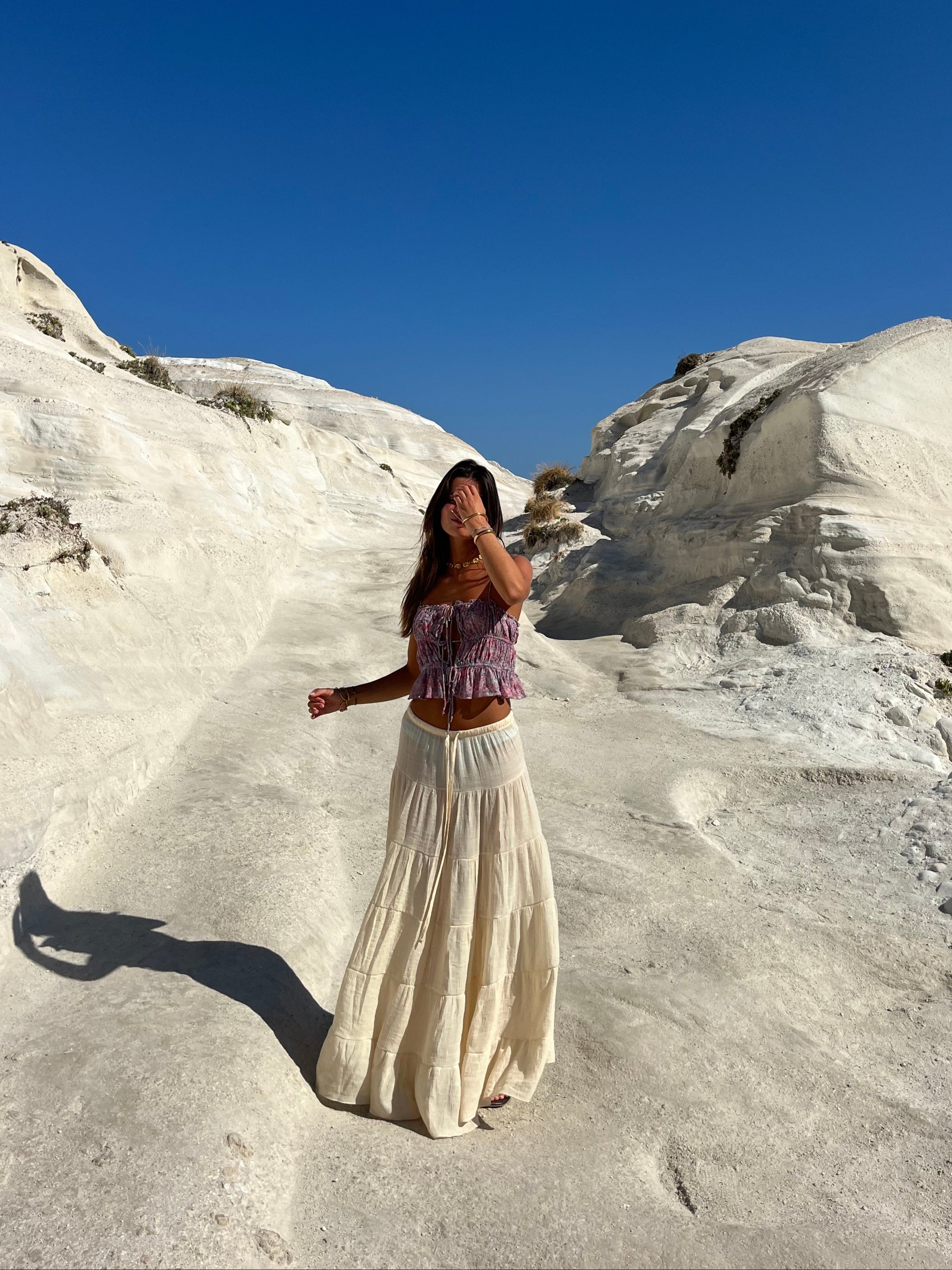 Loose and airy maxi skirt in classic white, perfect for the hot summer days. It is sewn in a thin summer fabric that feels light and comfortable against the skin - the skirt has built-in lining for about half the length;