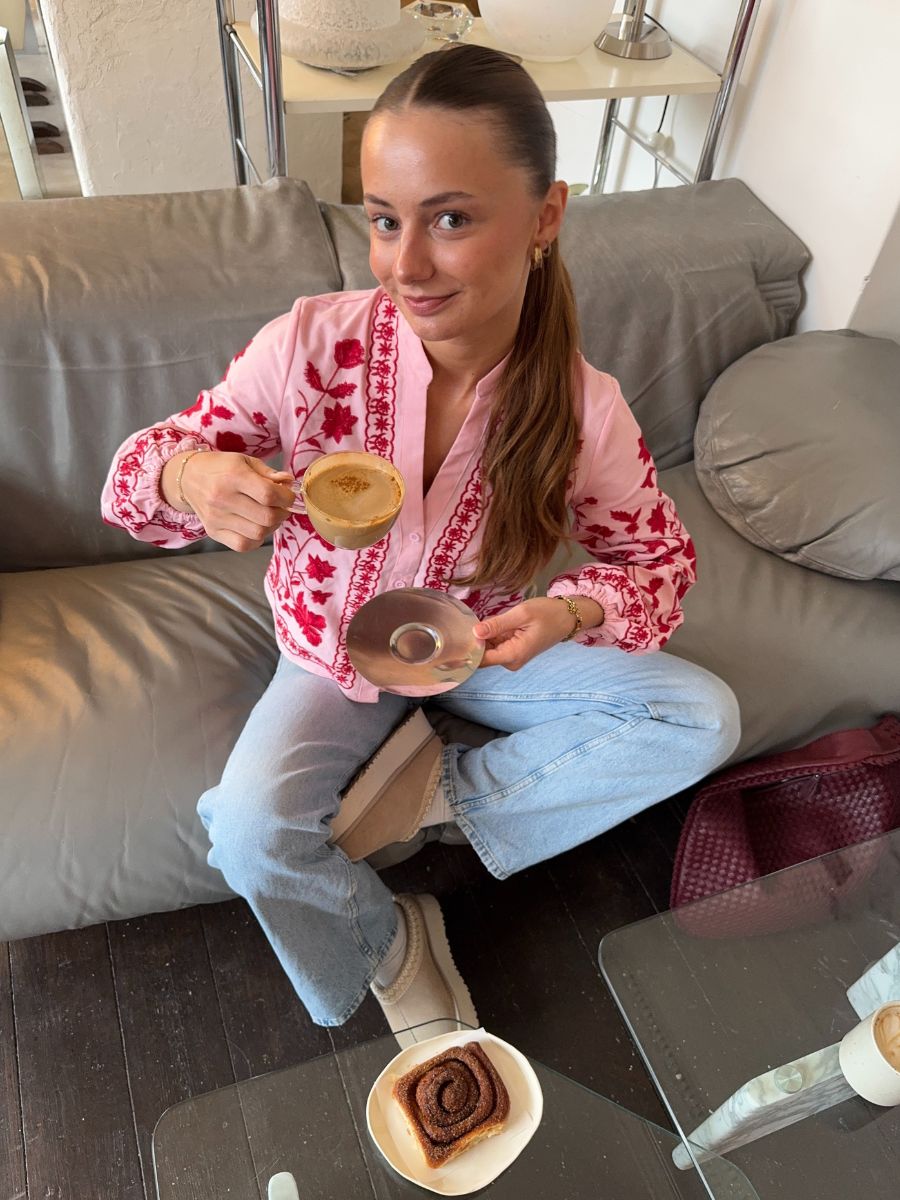 Our lovely Emma shirt with balloon sleeves comes in a light pink/pink base with red embroidery. The shirt has a button closure at the front but can also be styled as a cardigan when worn open 💖