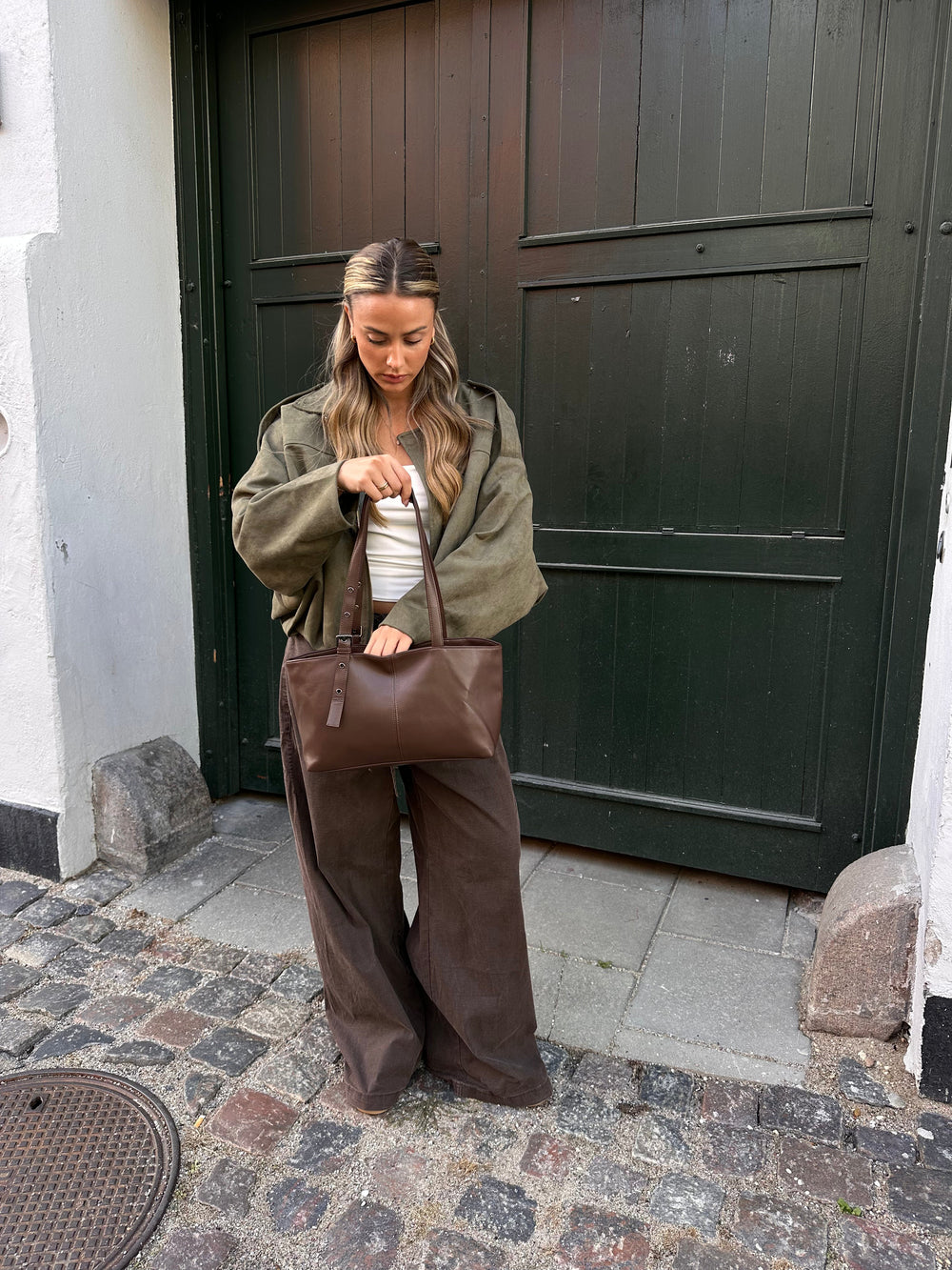 Our Ingrid bag with eyelet design. The bag is dark brown and has long, adjustable shoulder straps on both sides of the bag. Perfect bag to take with you on the go.