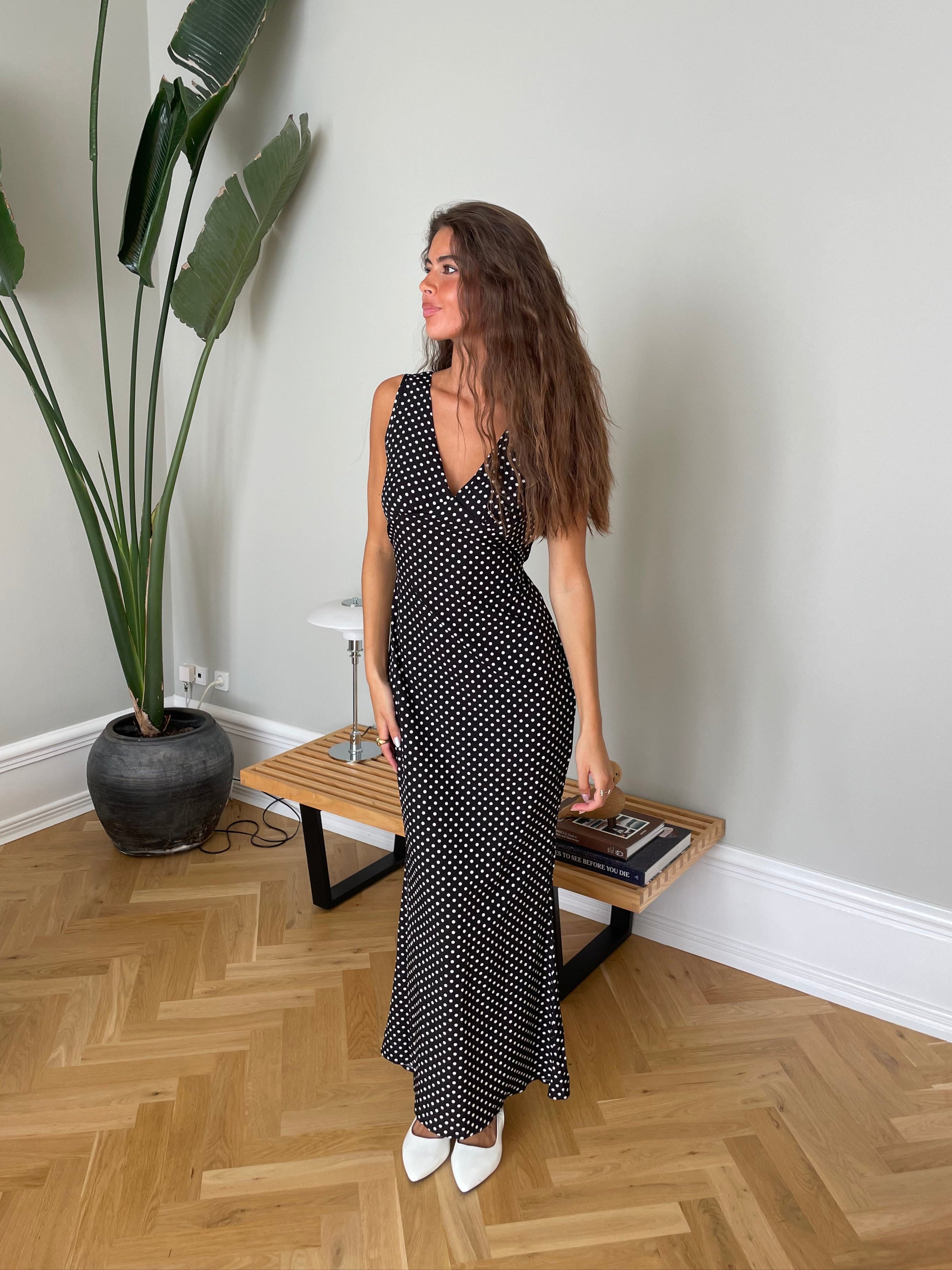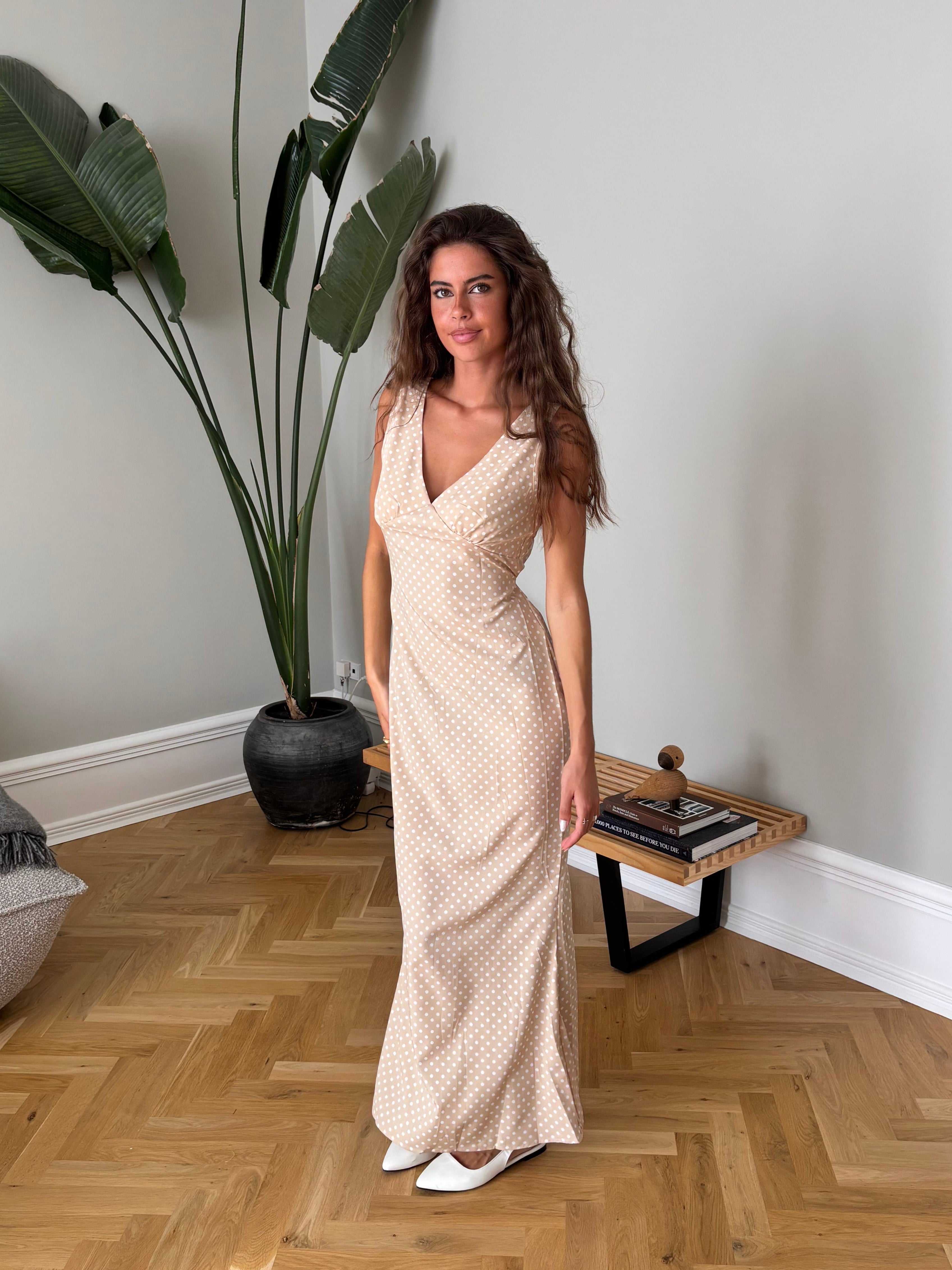 The Vida dress is an elegant, figure-hugging maxi dress with the finest white dots on a beautiful brown background. It has a flattering V-neckline and wide straps, giving it a classic and feminine look. There is a discreet ribbon at the waist that can be tied at the back, naturally accentuating your figure. The dress is floor-length and is perfect for everything from summer parties to more relaxed days when you still want to feel extra special 🤎