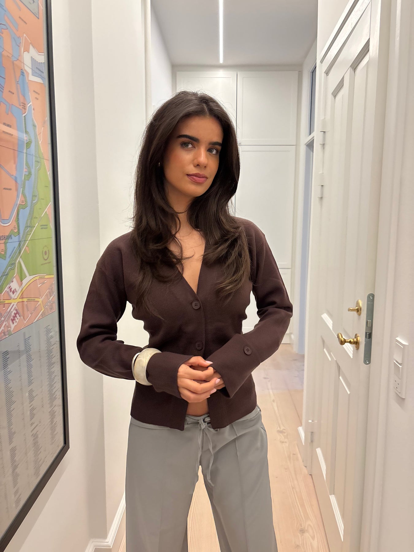 Our Frida fitted cardigan comes in a beautiful deep brown shade with a fitted cut and deep V-neck that accentuates the silhouette. The cardigan fastens with two buttons at the front and has delicate button details on the sleeves. Can be styled open or closed and pairs perfectly with jeans, a skirt, or over a dress. A versatile and timeless choice for your wardrobe.