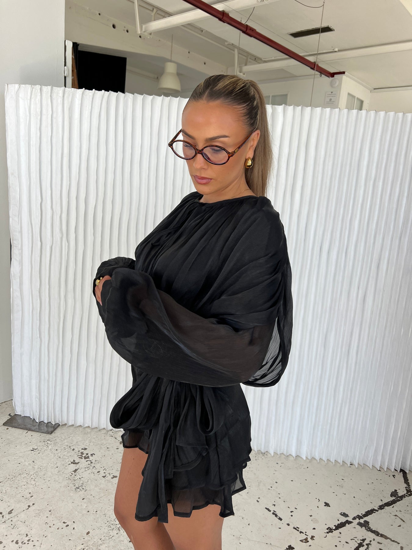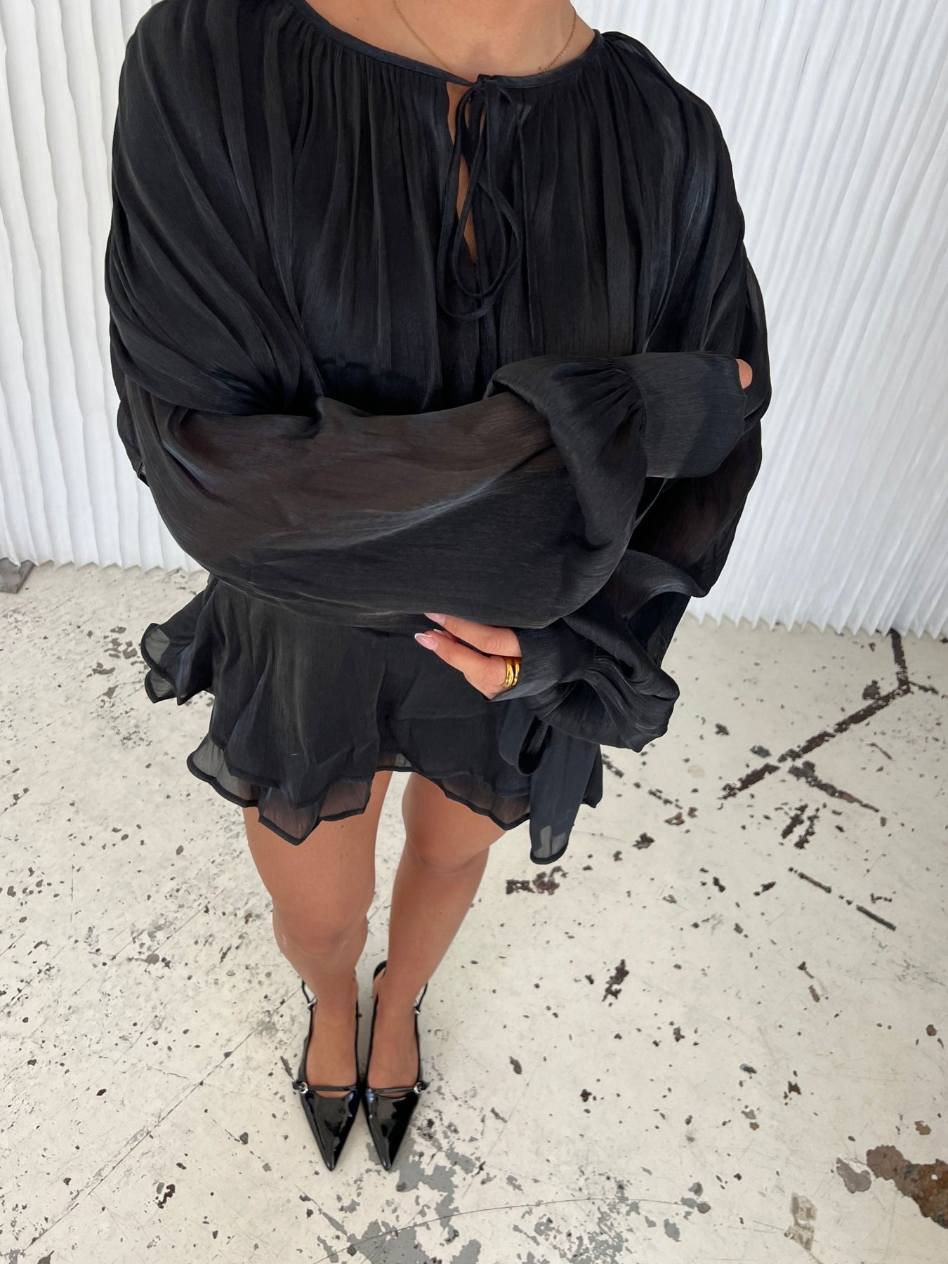 Our Kalia mini dress is the epitome of femininity mixed with pure elegance. The dress is designed in a light, shiny material that falls beautifully and creates an airy look. It has long, loose-fitting sleeves with buttons at the end and a tie at the waist that flatters the figure. The short, layered skirt gives the dress a romantic and playful look and is perfect for any occasion, whether you're going to a party or just out for the evening.