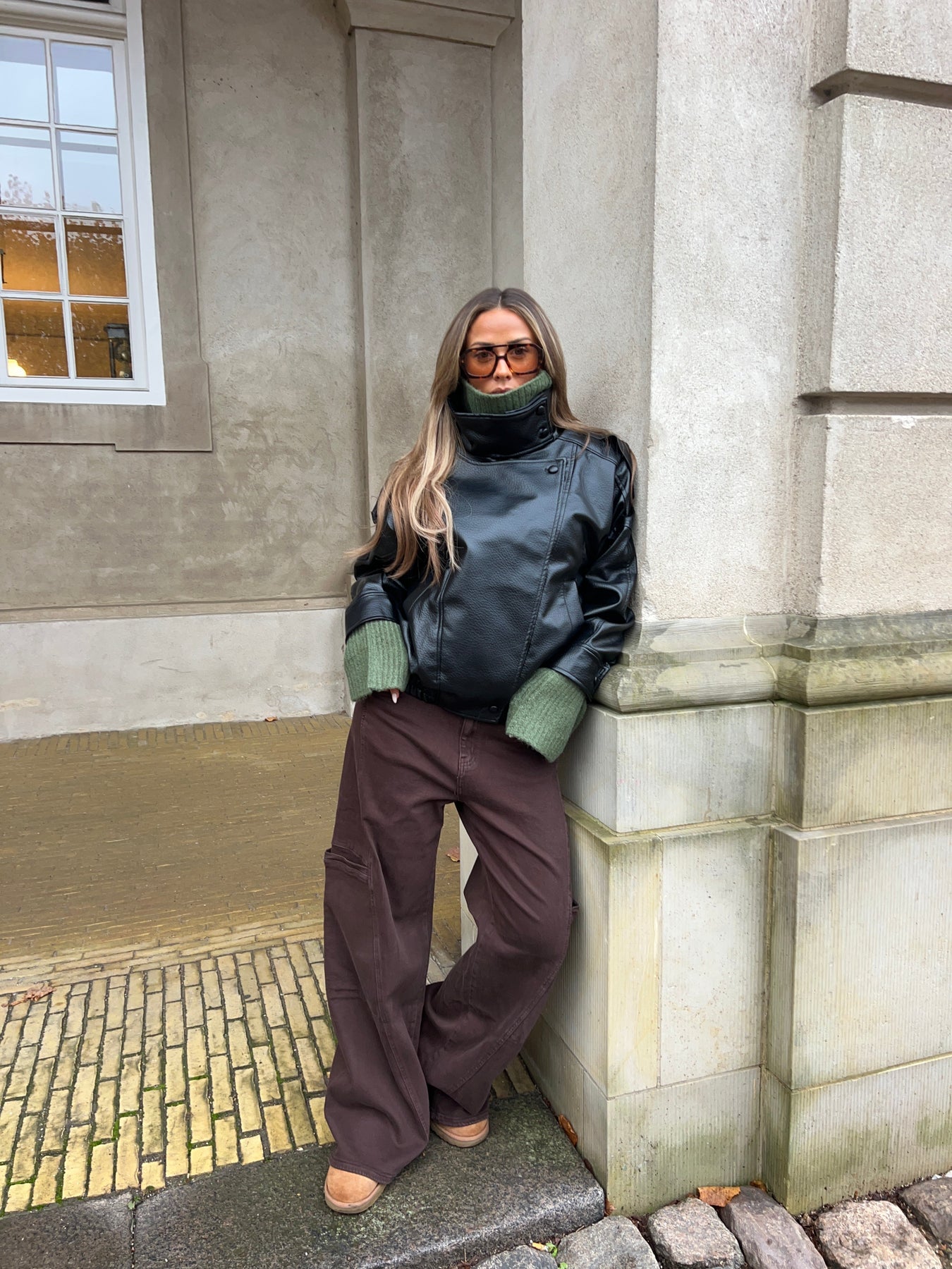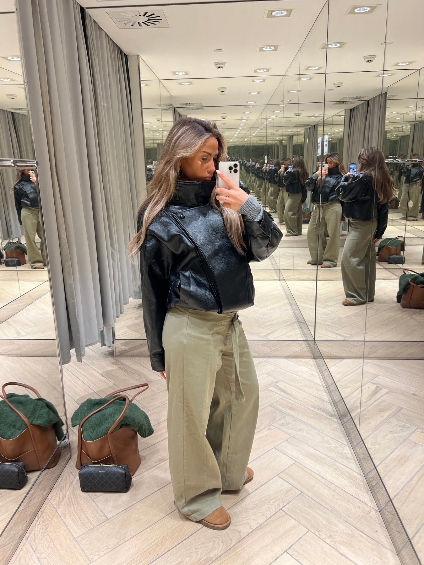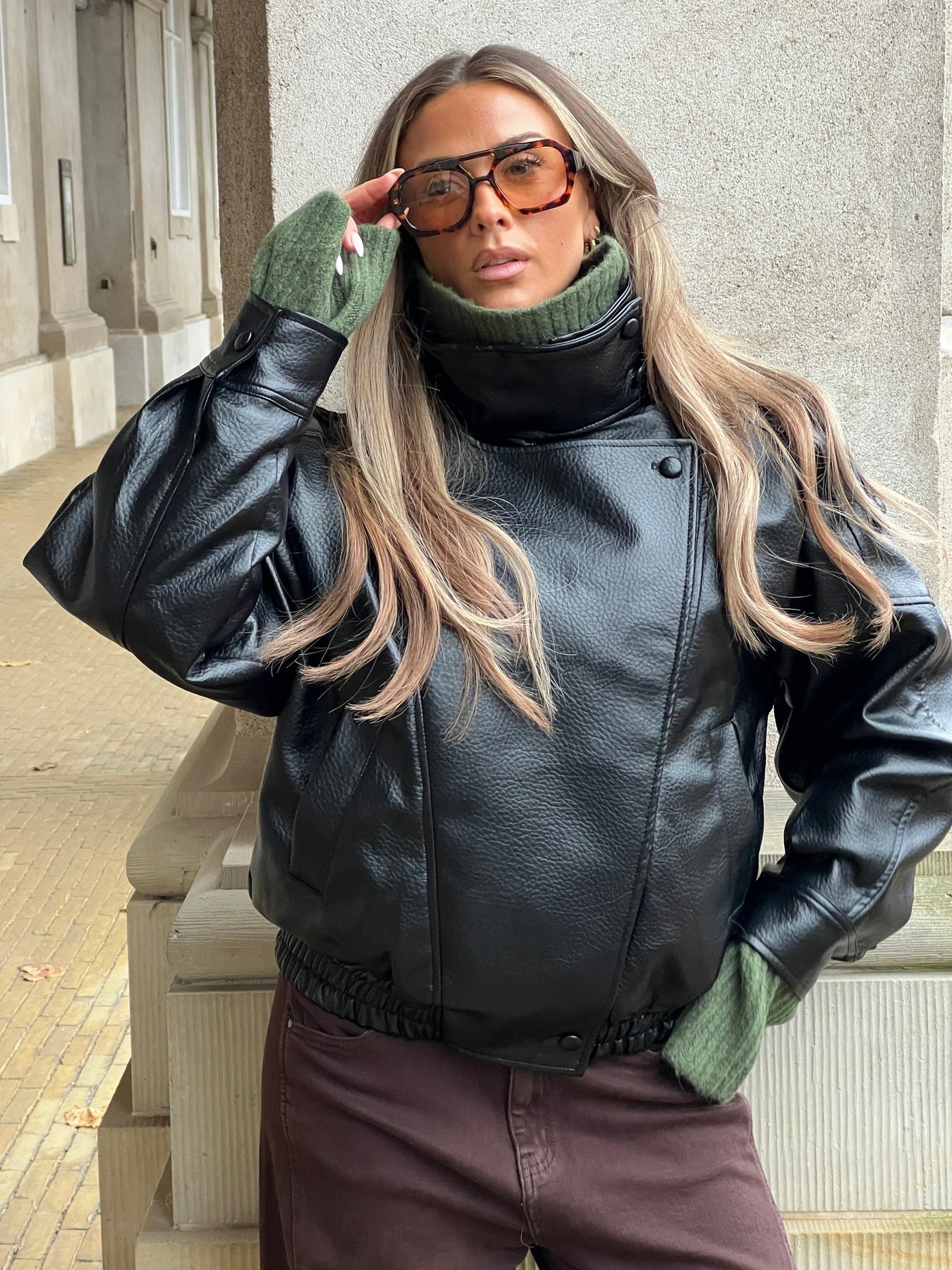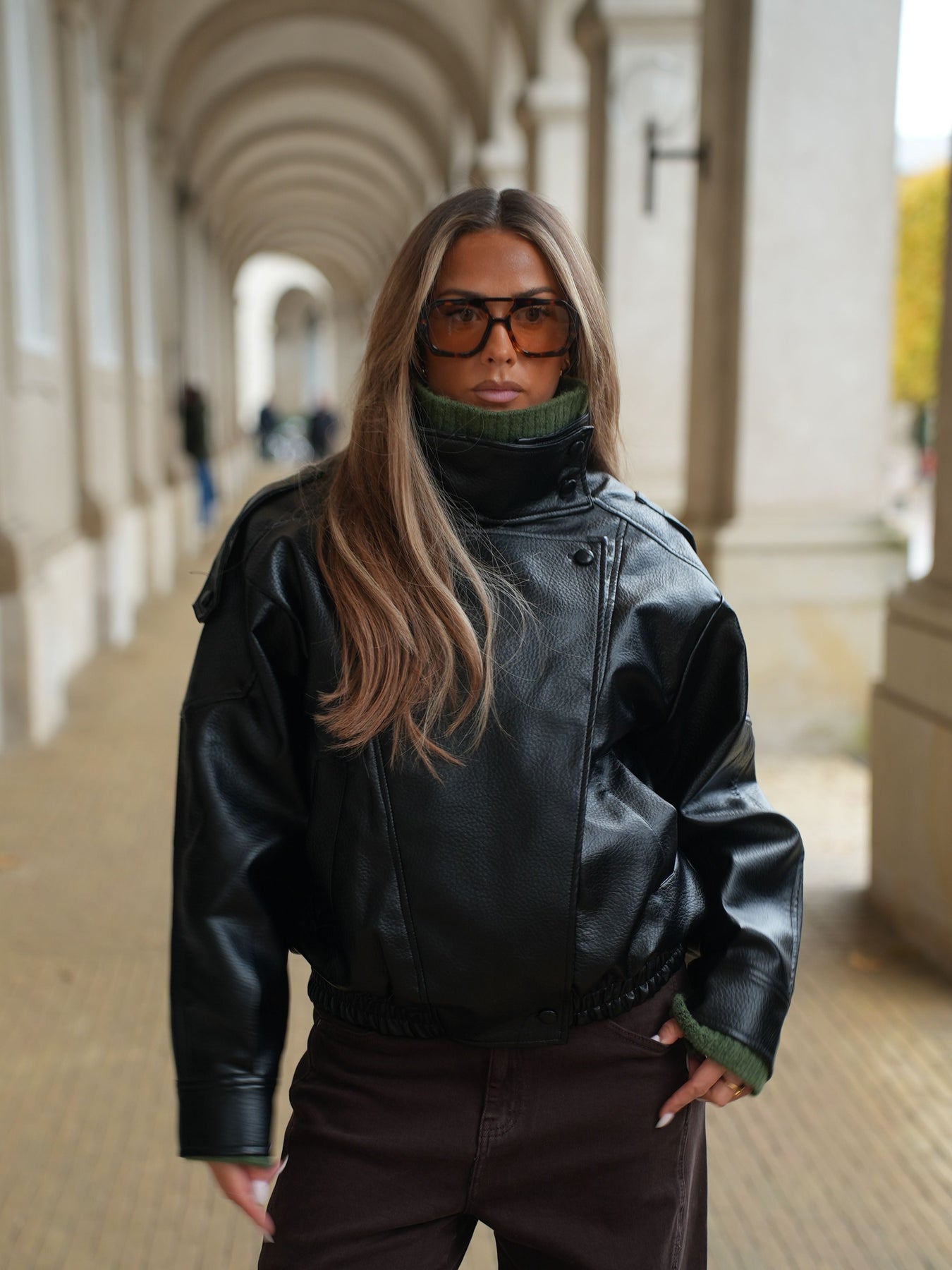 Our Linea pu high neck jacket combines a raw look with a stylish fit. The distinctive shoulder straps give it a cool, structured look, while the asymmetrical closure at the side adds a unique detail. The high neck provides both warmth and edge, and the material has a luxurious, slightly shiny surface that makes the jacket extra eye-catching.