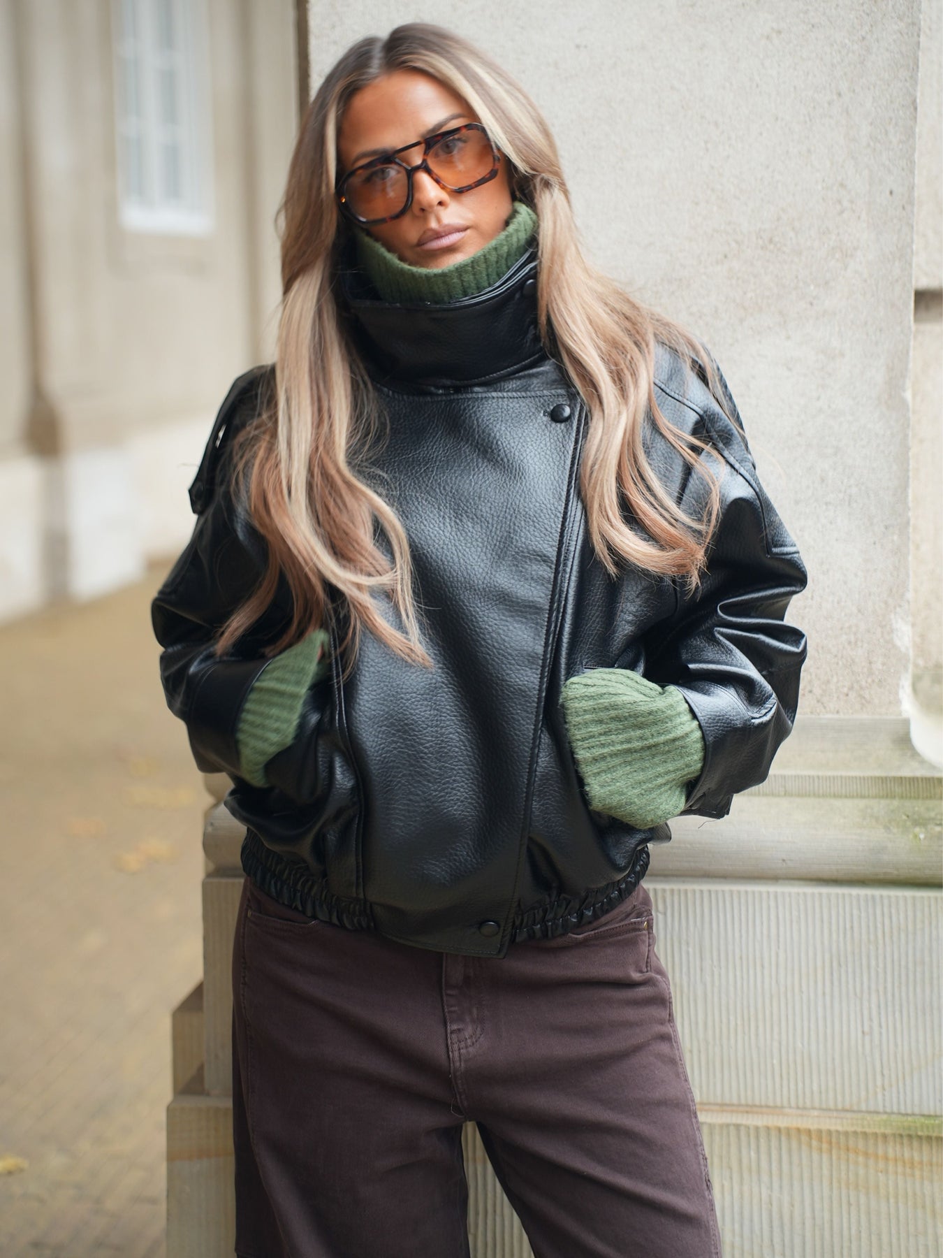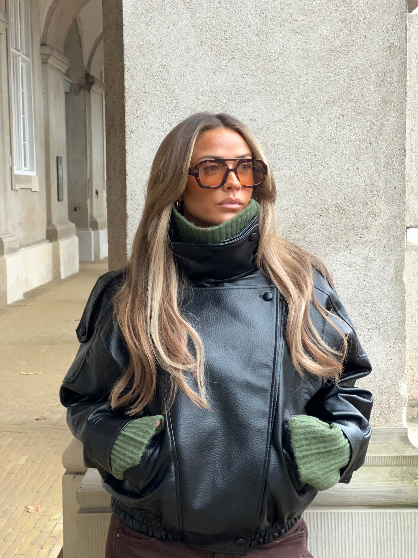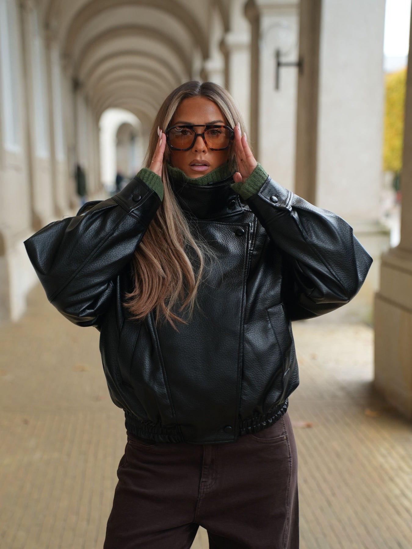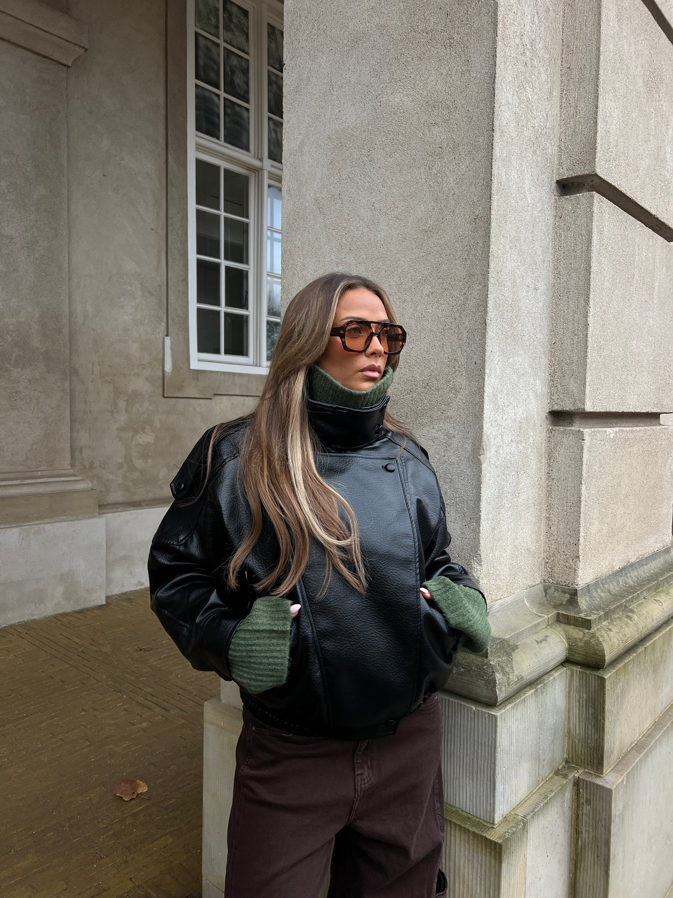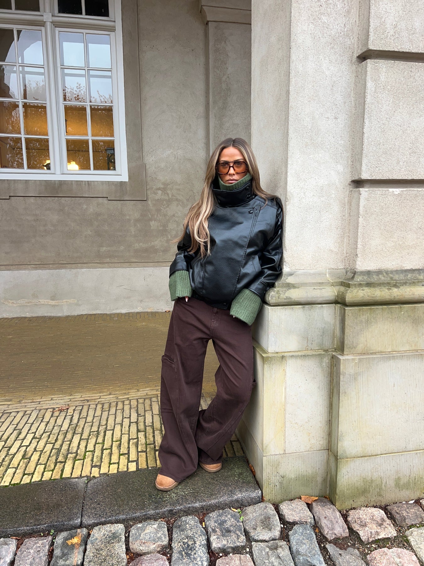 Our Linea pu high neck jacket combines a raw look with a stylish fit. The distinctive shoulder straps give it a cool, structured look, while the asymmetrical closure at the side adds a unique detail. The high neck provides both warmth and edge, and the material has a luxurious, slightly shiny surface that makes the jacket extra eye-catching.