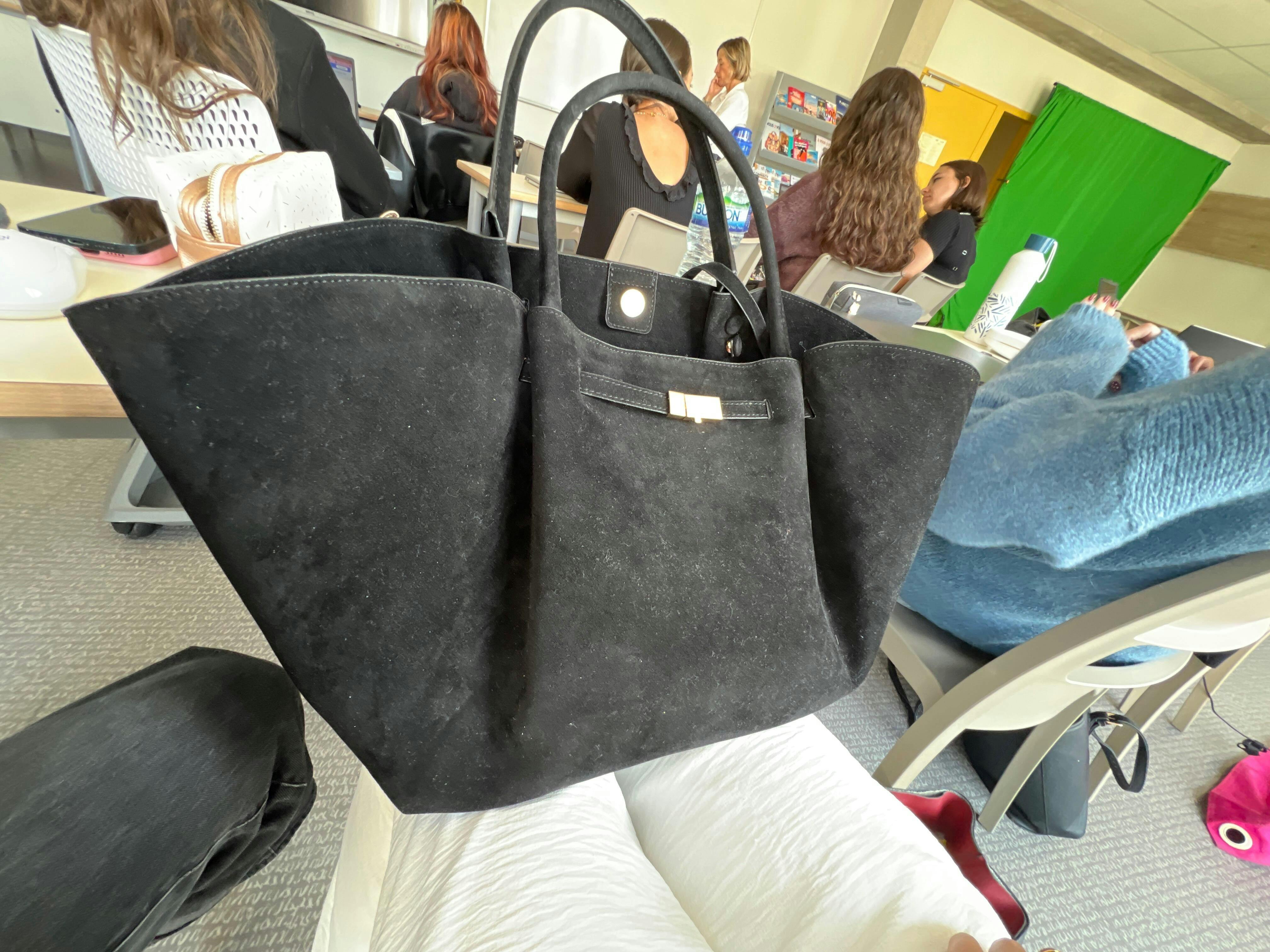 Our brand new Lily bag comes in a suede-like material. The material has a reflective suede surface. The bag has lots of nice details, and it also comes with a small mirror and a purse. It has two side compartments inside, one zippered compartment, and one open compartment. The bag can hold a 16" Macbook.
