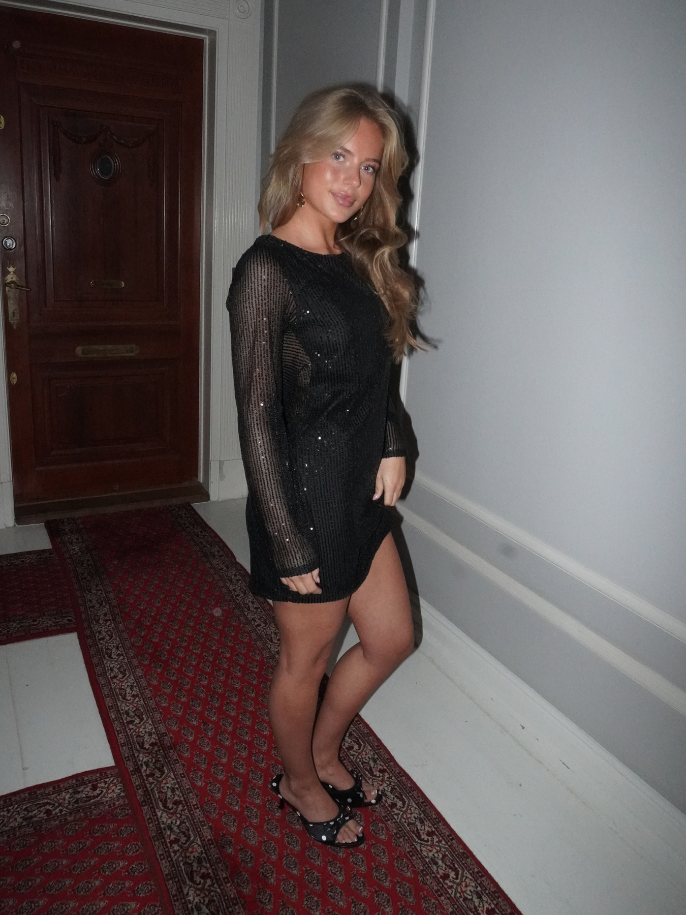 Our Giulia glitter dress is the perfect addition to your wardrobe when you need that little extra something. The close fit and soft, stretchy material make it comfortable to wear, while the glittery surface gives it an eye-catching look. The dress is short with a low back and can be styled casually with cowboy boots or more elegantly with sandals or stilettos.