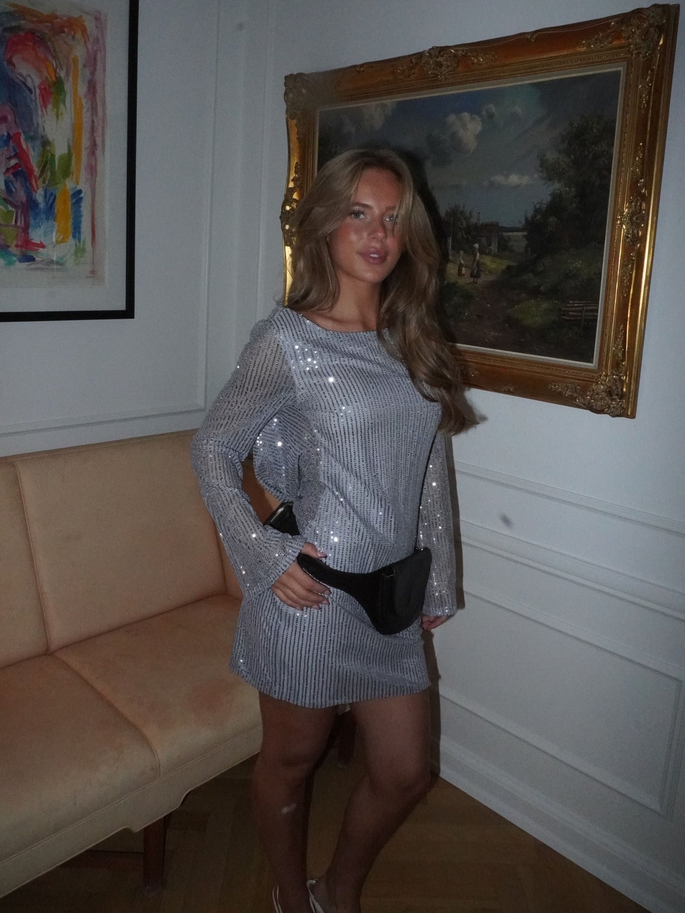 Our Giulia glitter dress is the perfect addition to your wardrobe when you need that little extra something. The close fit and soft, stretchy material make it comfortable to wear, while the glittery surface gives it an eye-catching look. The dress is short with a low back and can be styled casually with cowboy boots or more elegantly with sandals or stilettos.