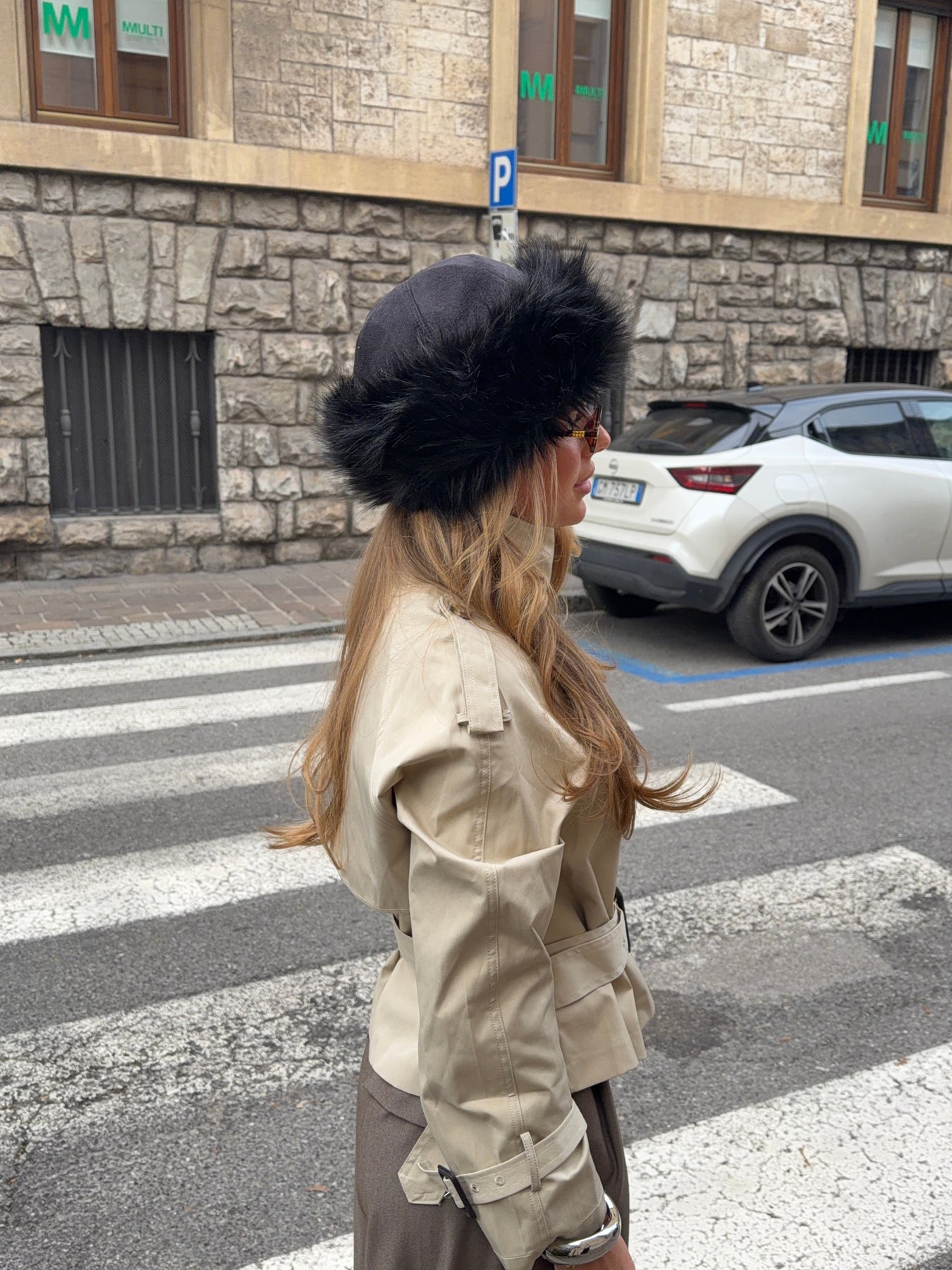 Aria shearling hat is a stylish and distinctive accessory that combines a raw look with soft comfort. The soft shearling edge frames the face and gives the hat an exclusive and eye-catching look, while the smooth surface creates a beautiful contrast in the material.