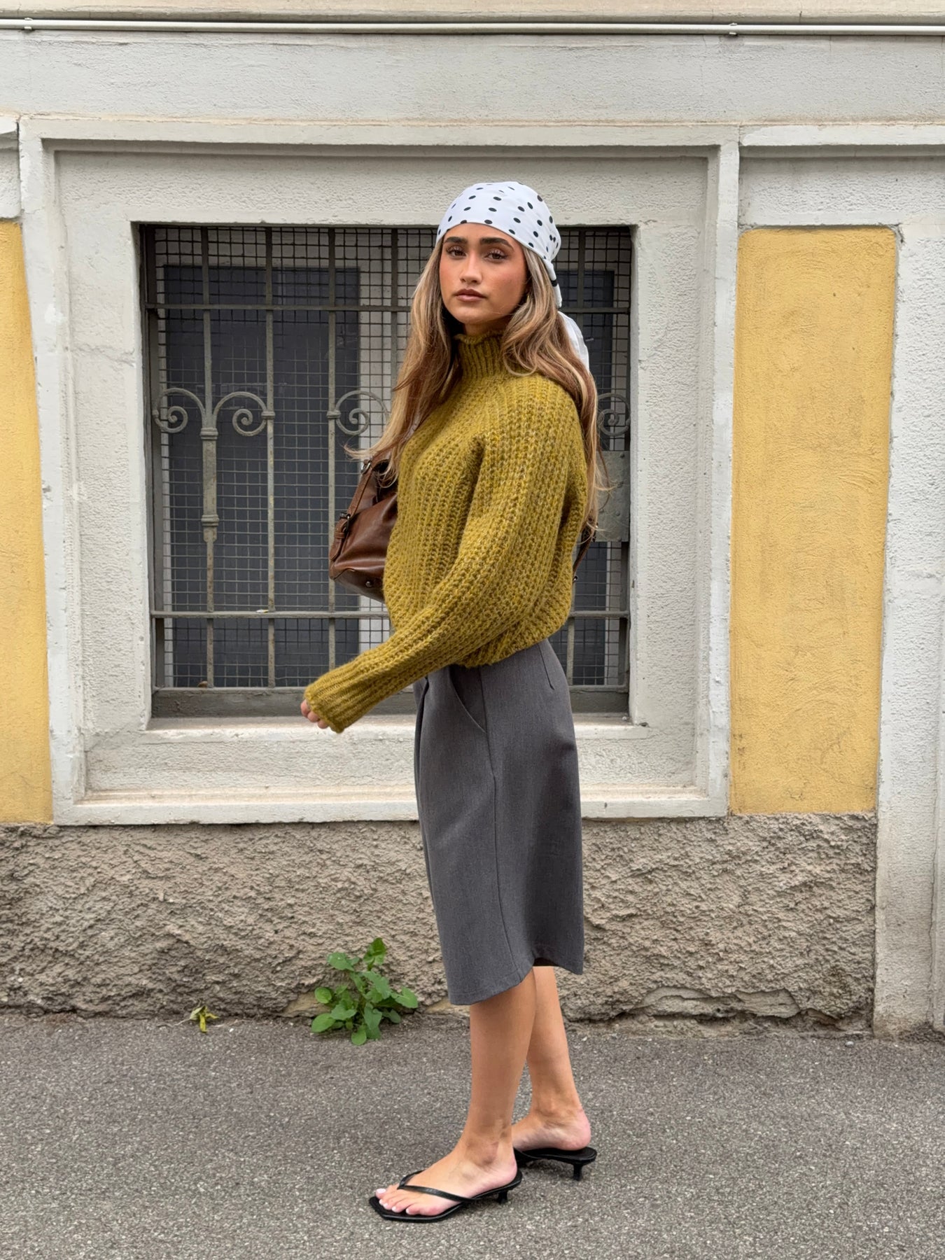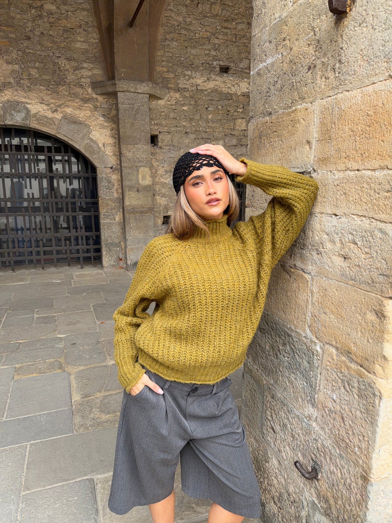 Our Carla chunky high-neck sweater is a warm and stylish knit with a modern, relaxed look. It’s knitted in a chunky ribbed pattern and features a high neck that offers both comfort and an elegant look. The slightly voluminous sleeves and loose fit create a casual silhouette that makes the sweater easy to style with pants, skirts, and jeans. The olive green color offers a calm and timeless look that fits perfectly into your fall and winter wardrobe. A soft and comfortable knit, ideal for chilly days.
