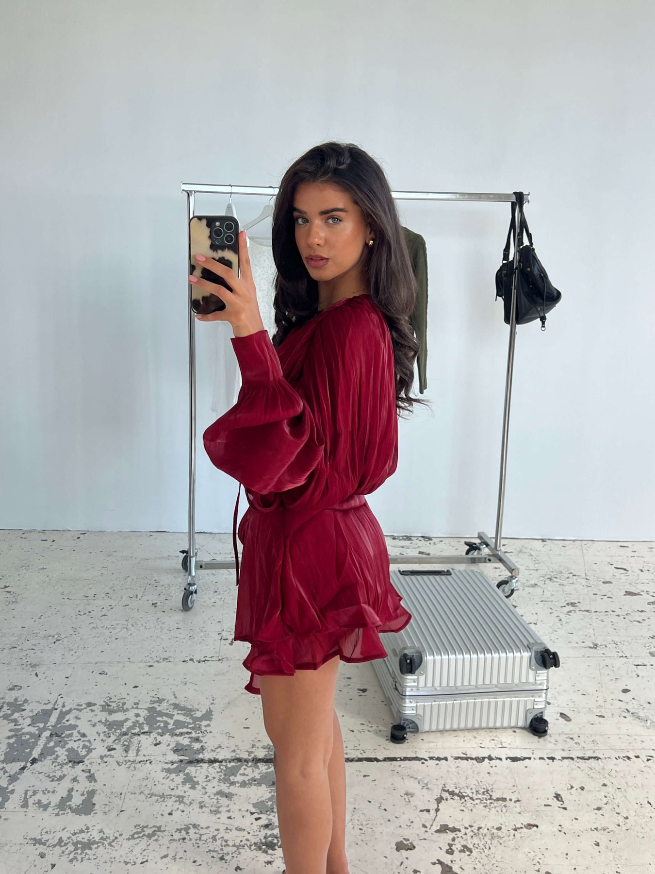 Our Kalia mini dress is the epitome of femininity mixed with pure elegance. The dress is designed in a light, shiny material that falls beautifully and creates an airy look. It has long, loose-fitting sleeves with buttons at the end and a tie at the waist that flatters the figure. The short, layered skirt gives the dress a romantic and playful look and is perfect for any occasion, whether you're going to a party or just out for the evening.