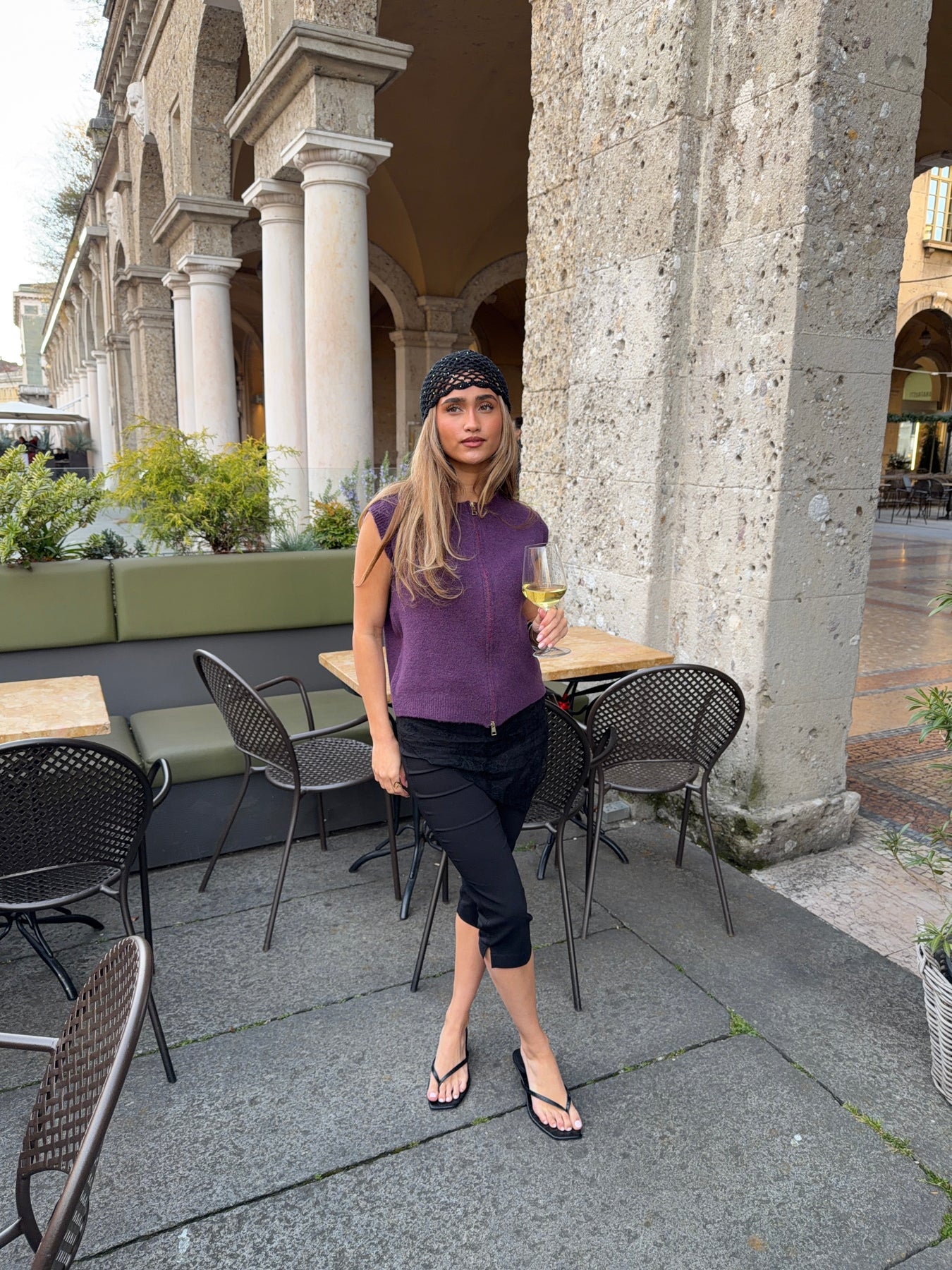Our Tora knit vest is a soft and stylish knit that offers a modern and relaxed look. The vest features a classic round neck and fastens at the front with a discreet zipper, creating a cool and simple look. The slightly loose fit and wide shoulders create a flattering silhouette, making it easy to style on its own or over a shirt or blouse. The deep berry/purple color adds a warm and elegant touch that fits perfectly into your fall and winter wardrobe. A versatile knit vest that works for both everyday wear and more dressed-up looks.