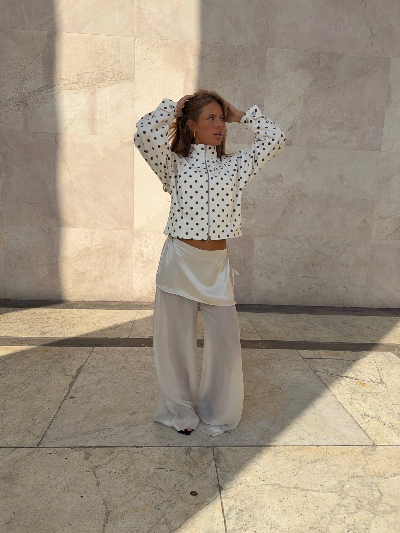Our Gaia tie-detail mesh pants in off-white combine a light and elegant look with a comfortable fit. The pants are designed in a loose fit with wide legs that give an airy and relaxed drape. The mesh material adds a light and modern look, while the satin tie detail at the waist creates a beautiful contrast and gives the design an exclusive touch. The delicate tie detail accentuates the waist and adds a feminine touch to the pants. A versatile pair of pants that are perfect for both casual days and more sophisticated outfits.