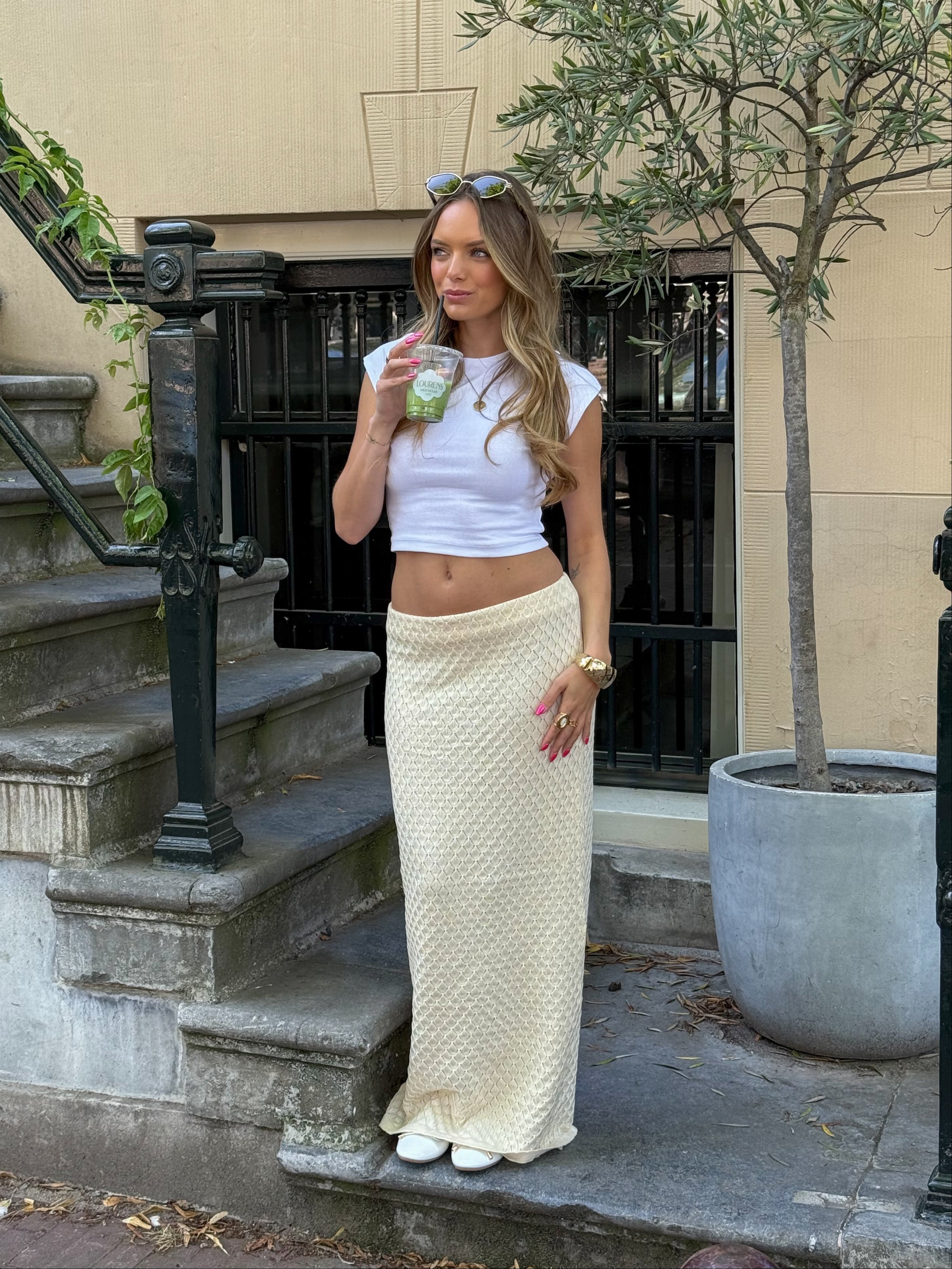Maddy is a long knit skirt with a beautiful pattern that adds texture and charm. It comes in a soft and elegant black color that suits any look. The skirt can easily be styled on its own or with the matching top if you want a complete set. Perfect for both everyday wear and weekends when you want to be comfortable and cool.